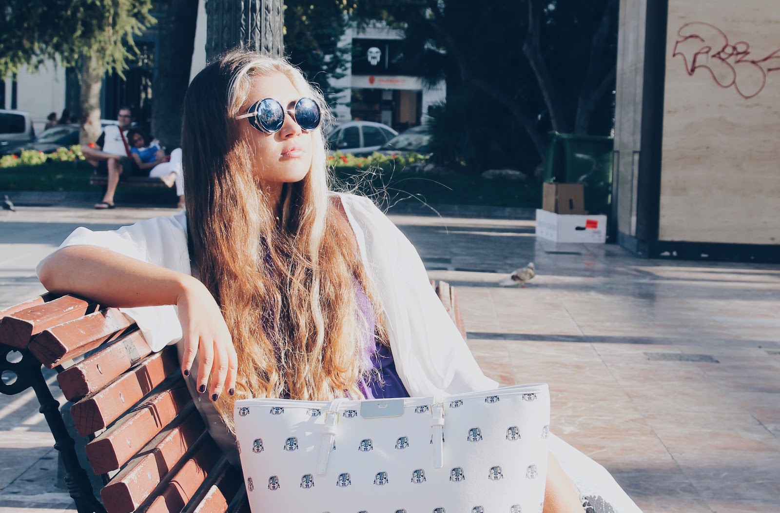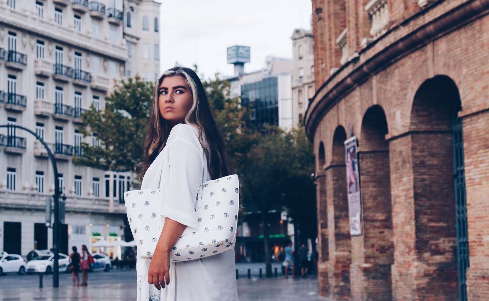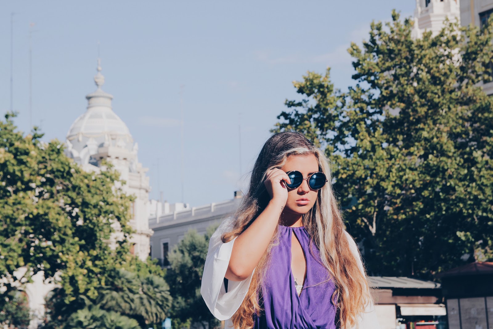 Hi there! Today I would like to take you for a walk with me in Valencia, Spain. You will see amazing arhetecture of the main plaza in the city, Plaza del Ayuntamiento, and palace of corrida. I picked up this look, taking into account 38 degree heat. My shoulders were rescued by a kimono with sea waves, which you have seen in another photoshoot. By the way, it is The Great Wave off Kanagawa, also known as The Great Wave, which is a woodblock print by the Japanese artist Hokusai. I am an art lover, thus I am in love with the clothes based on the pictures.
